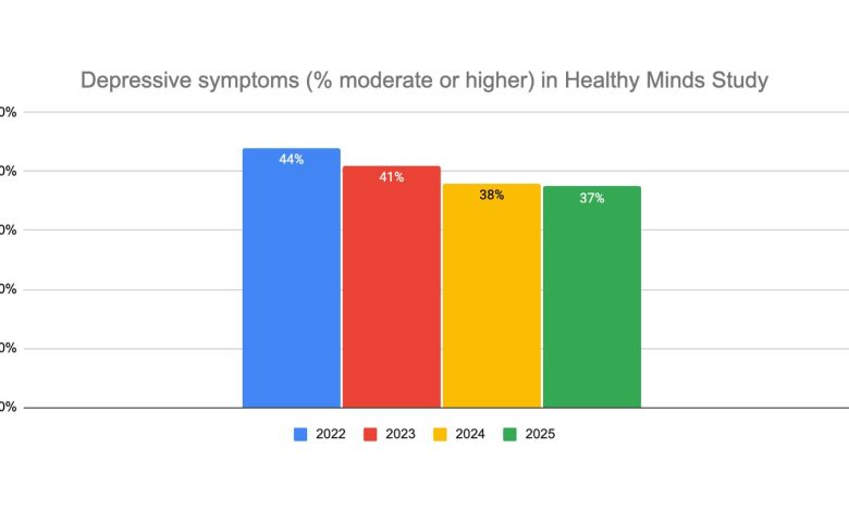 O estudo Healthy Minds de 2025 descobriu que a porcentagem de entrevistados que relataram sintomas depressivos (% moderado ou superior) caiu a cada ano de 2022 a 2025. Crédito: equipe da Healthy Minds Network