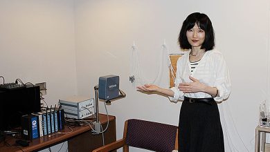 Panying Rong mostra alguns dos equipamentos que os pesquisadores em seu laboratório usam para medir os órgãos da fala. Crédito: Rick Hellman/KU