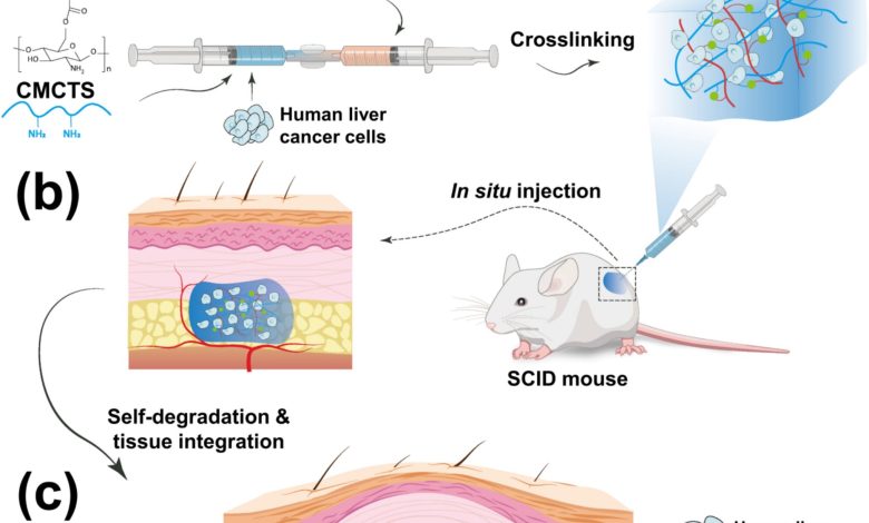 Procedimentos de preparação de hidrogel injetável CMCTs/oHA encapsulados em células de câncer de fígado humano de alta densidade e sua aplicação in vivo. Crédito: Compósitos Avançados e Materiais Híbridos (2025). DOI: 10.1007/s42114-025-01429-4