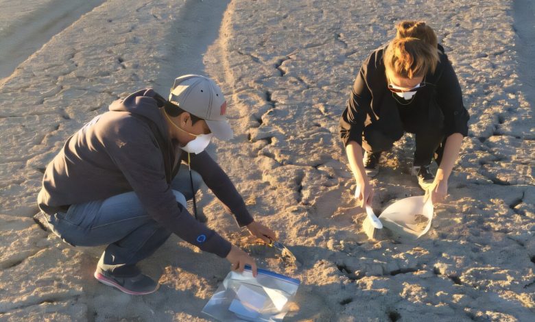 Pesquisadores do estudo liderado pela UC Irvine coletam amostras de poeira na extremidade sul do Mar Salton. Crédito: Escola de População e Saúde Pública Joe C. Wen
