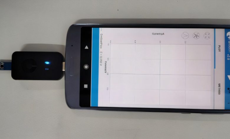 Aparelho conectado à porta USB de um celular: testado com as substâncias AB-Chminaca e MDMB-4en-Pinaca, dois dos canabinoides sintéticos mais comuns e perigosos, o aparelho demonstrou capacidade de detectar concentrações muito baixas. Crédito: Larissa Melo/INCT-SP