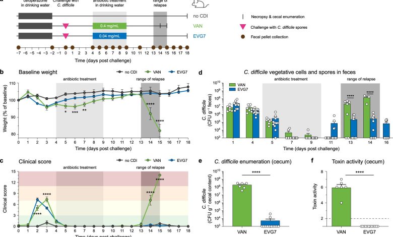 O EVG7 oral previne a recorrência em um modelo de rCDI em camundongos. Crédito: Comunicações da Natureza (2025). DOI: 10.1038/s41467-025-64067-w