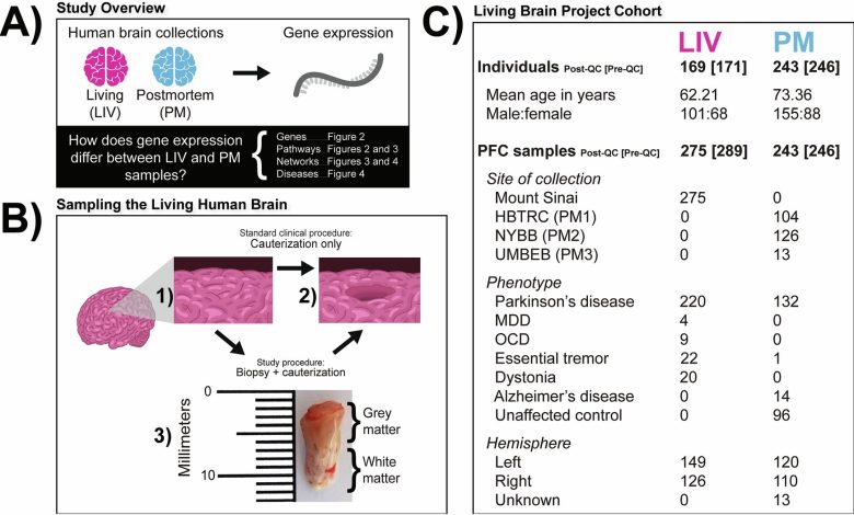 O Psiquiatria Molecular O estudo apresenta o Living Brain Project e apresenta múltiplas linhas de evidência de que a expressão genética no tecido cerebral humano post-mortem pode nem sempre ser uma representação precisa da expressão genética no tecido cerebral humano vivo. Além disso, o estudo sugere que as assinaturas de expressão genética post-mortem de doenças neurológicas e mentais, bem como de fenótipos normais como o envelhecimento, podem nem sempre ser retratos precisos dessas assinaturas de expressão genética no cérebro vivo.
