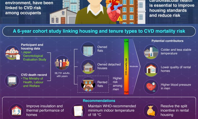Um estudo de coorte de 6 anos conduzido por investigadores do Japão, abrangendo quase 39.000 adultos mais velhos, descobriu que as pessoas que vivem em apartamentos alugados e casas isoladas ocupadas pelos proprietários enfrentam riscos mais elevados de morte cardiovascular em comparação com aquelas que vivem em apartamentos ocupados pelos proprietários. O estudo atribui o risco aumentado a temperaturas interiores mais frias e menos estáveis nestes tipos de habitação e sugere que melhorar a qualidade da habitação para resolver estes problemas poderia reduzir a mortalidade cardiovascular, particularmente entre os homens.