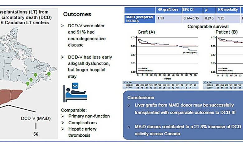 Uma primeira comparação do transplante de fígado no Canadá usando órgãos doados após assistência médica na morte (MAiD) mostrou boa sobrevida do paciente com resultados semelhantes à doação padrão de órgãos. Crédito: Revista de Hepatologia /Parente et al.