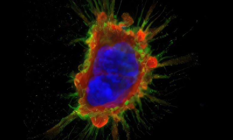 Uma célula de câncer ósseo mostrando onde estão localizadas suas fibras de suporte (em vermelho), material genético (em azul) e a proteína alvo específica LRRC15 (em verde). Crédito: Laboratório Ulmert