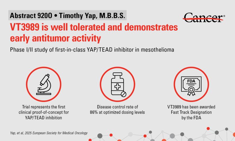 O primeiro inibidor YAP-TEAD da categoria, VT3989, continuou a ser bem tolerado e demonstrou notável atividade antitumoral inicial, particularmente em pacientes com mesotelioma refratário, de acordo com os resultados de um estudo liderado por pesquisadores do MD Anderson Cancer Center da Universidade do Texas.