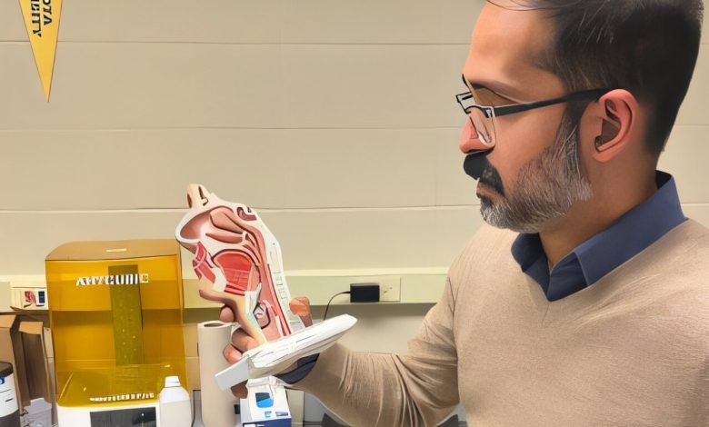 Saikat Basu com um modelo de vias aéreas humanas em seu laboratório. Crédito: Universidade Estadual de Dakota do Sul