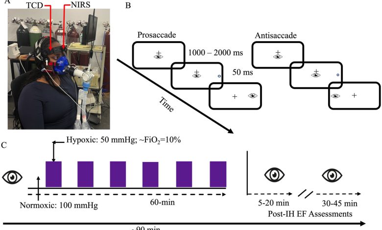 O painel A mostra o aparato experimental e o posicionamento do ultrassom Doppler transcraniano e das sondas de infravermelho próximo. O Painel B mostra a linha do tempo de eventos visuais e motores associados a ensaios pró e antisaccade. O Painel C fornece um esquema do tempo das avaliações oculomotoras (ou seja, ícone do olho) e o tempo dos intervalos normóxicos e hipóxicos dentro do protocolo de hipóxia intermitente (HI). Para todos os participantes, o primeiro intervalo do protocolo HI foi normóxico e o último intervalo foi hipóxico. Crédito: Psicofisiologia (2025). DOI: 10.1111/psyp.70161