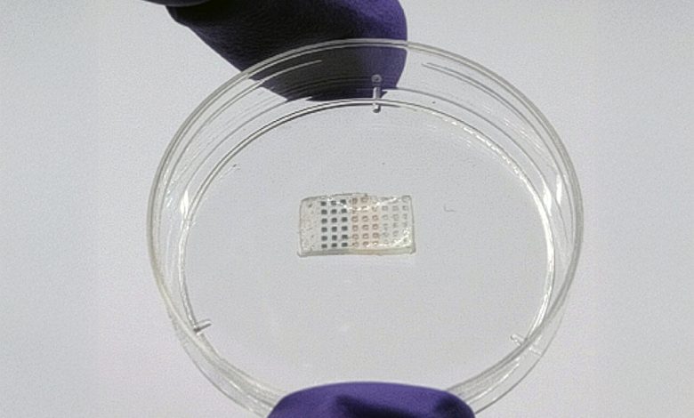 Os pesquisadores incorporaram fileiras dessas partículas em finas folhas de um hidrogel resistente, mas flexível, semelhante a uma lente de contato. Este hidrogel é feito de alginato e PEGDA, dois polímeros biocompatíveis que eventualmente se decompõem no corpo. Para este estudo, os pesquisadores criaram manchas compactas e em miniatura com apenas alguns milímetros de diâmetro.