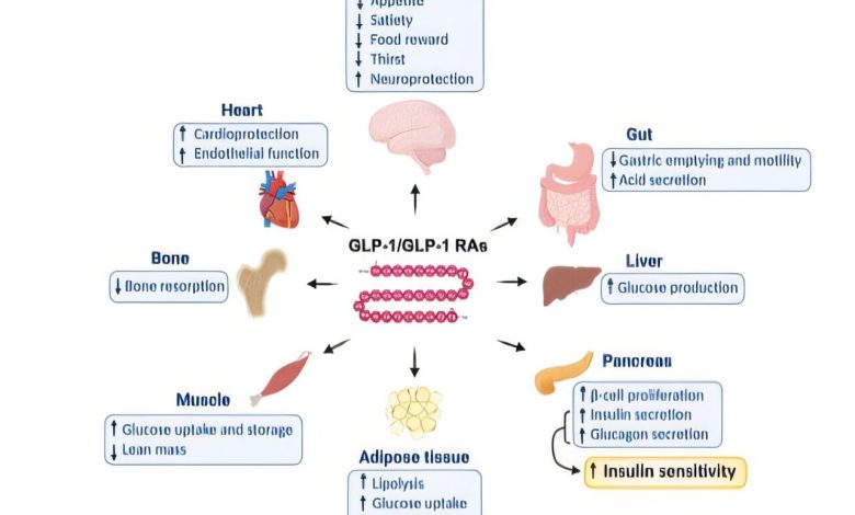 Efeitos dos agonistas do receptor GLP-1 e GLP-1 em múltiplos órgãos. Crédito: white paper IIFH