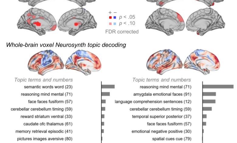Análise de parcelamento de todo o cérebro e decodificação de Neurosynth. A) Associação entre atividade cerebral e eficácia da mensagem de autorrelato (ME) em indivíduos submetidos a neuroimagem. B) Associação entre atividade cerebral média de indivíduos submetidos a neuroimagem e EM em escala (em grandes grupos que não foram submetidos a neuroimagem). Crédito: Nexus do PNAS (2025). https://academic.oup.com/pnasnexus/article-lookup/doi/10.1093/pnasnexus/pgaf287