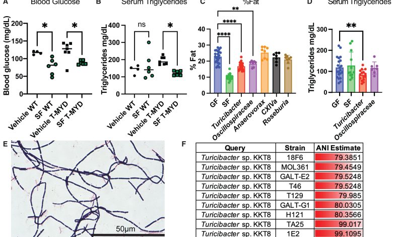 Identificação de micróbios indutores de magreza da comunidade SF (A e B) (A) Glicemia em jejum e (B) triglicerídeos séricos de homens WT e T-MyD88 de 8 semanas de idade−/− camundongos em um HFD suplementado com SF por 2 meses (WT, n = 10; T-Myd88−/−n = 13). Crédito: Metabolismo Celular (2025). DOI: 10.1016/j.cmet.2025.10.007