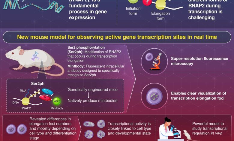 O modelo se concentra na detecção da fosforilação de Ser2 (Ser2ph), uma importante modificação molecular que o RNAP2 sofre e mantém durante o alongamento. Os pesquisadores modificaram ratos geneticamente modificados para expressar um anticorpo intracelular fluorescente específico para modificação (também chamado de “mintbody”) que se liga especificamente ao RNAP2 modificado por Ser2ph. Usando microscopia de fluorescência de super-resolução, a equipe conseguiu visualizar claramente focos de alongamento da transcrição nos núcleos de células vivas de vários tecidos.