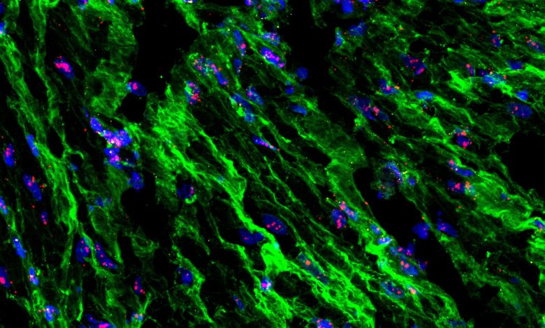 Transcrições de PIEZO1 no músculo uterino humano a termo. Verde indica fibras musculares lisas no útero, vermelho marca mRNA de PIEZO1 e azul mostra núcleos celulares. Crédito: Pesquisa Scripps