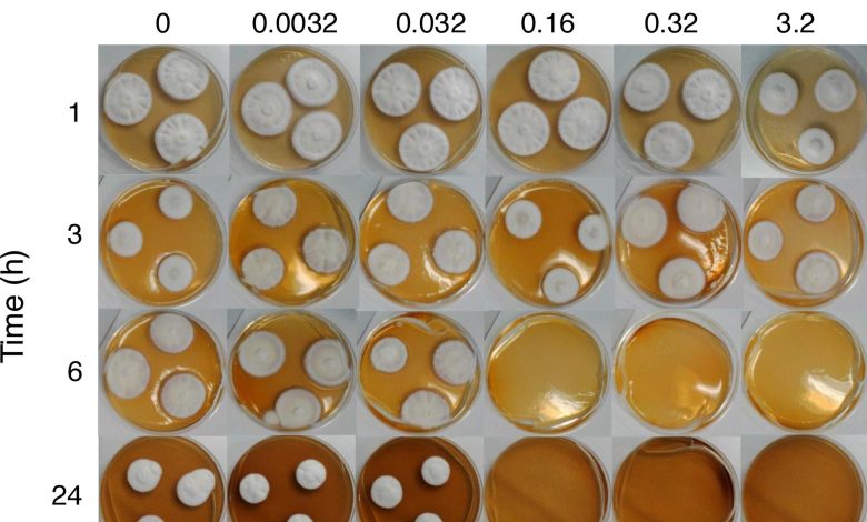 Efeito de H2Tempo de exposição e concentração de S contra T. rubrum. Placas de ágar foram inoculadas com 3 manchas de T. rubrum ATCC 28.188, incubadas em caixas herméticas por 1, 3, 6 e 24 horas, na presença de diferentes concentrações de H2S, seguido por uma nova incubação sem H2S por mais 7 dias. As concentrações H2S indicados são aqueles que seriam alcançados se todo o sulfeto disponível fosse liberado como H gasoso2S. Crédito: Relatórios Científicos (2025). DOI: 10.1038/s41598-025-22062-7
