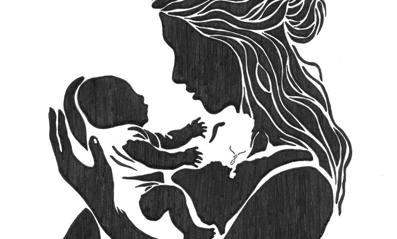 Ilustração de uma mulher carregando uma criança nos braços. Crédito: Nynke Wemer