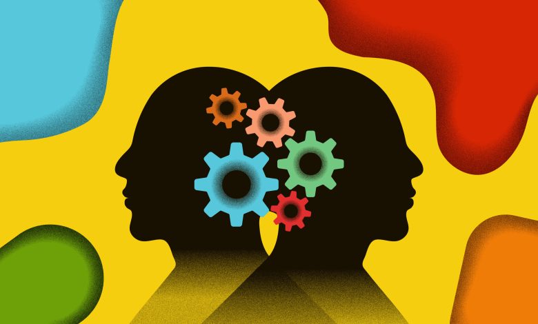 Uma imagem abstrata representando mecanismos compartilhados. Duas silhuetas são apresentadas costas com costas com rodas dentadas articuladas em cores brilhantes em suas cabeças, representando o mecanismo sináptico compartilhado. Um fundo colorido de amarelo, azul, verde, vermelho e laranja evoca positividade com a notícia de que este mecanismo compartilhado pode informar possíveis opções de tratamento. Crédito: Kaori Serakaki/OIST