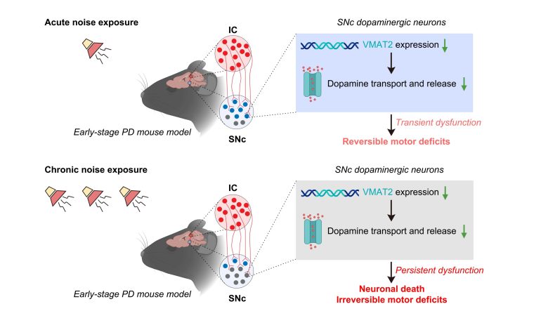Cui C, et al. Mudanças induzidas por ruído ambiental no circuito IC-SNc promovem déficits motores e vulnerabilidade neuronal em um modelo de rato com doença de Parkinson, Biologia PLOS (2025). DOI: 10.1371/journal.pbio.3003435