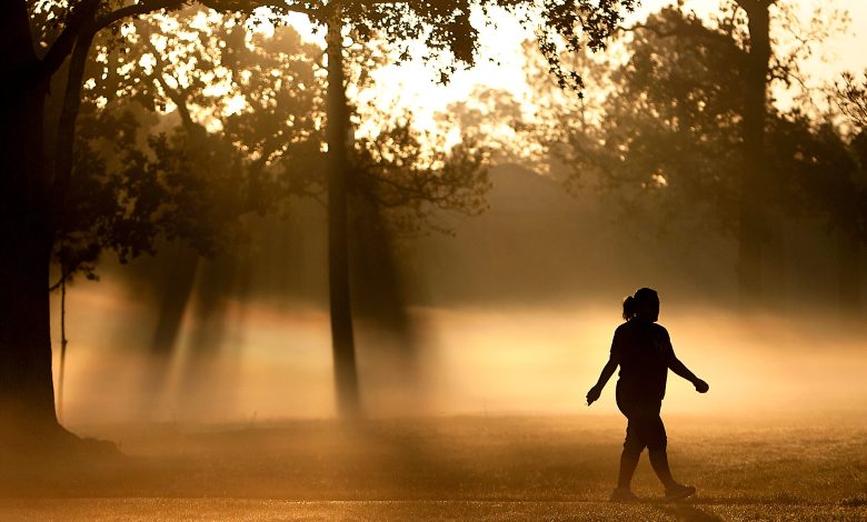 Uma mulher caminha por uma trilha enquanto a neblina se aproxima no Montie Beach Park, em Houston, na segunda-feira, 17 de outubro de 2011. Crédito: Cody Duty/Houston Chronicle via AP, File