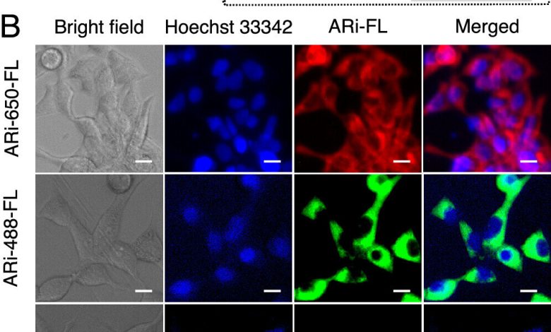 Captação e distribuição de sondas fluorescentes ARi-FL em linhagem celular de câncer de próstata humano. Crédito: Revista de Química Medicinal (2025). DOI: 10.1021/acs.jmedchem.5c00836