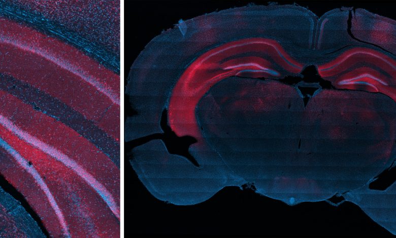 Duas imagens ampliadas de regiões do hipocampo mostrando alta eficiência de transdução do vetor entregue. Crédito: Laboratório de Neuroengenharia Não Invasiva / Rice University