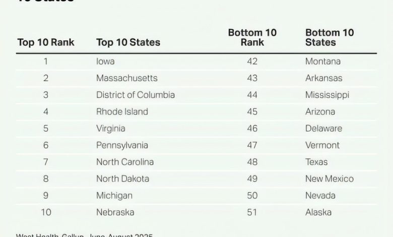 O Estudo SOS conclui que o local onde os americanos vivem tem um impacto significativo na forma como vivenciam os cuidados de saúde. Iowa, Massachusetts, o Distrito de Columbia e Rhode Island ocupam os primeiros lugares no país em termos de cuidados de saúde, com os residentes a relatarem melhores experiências globais, particularmente na sua capacidade de pagar, aceder e receber cuidados de qualidade quando e onde deles precisam, de acordo com o estudo West Health-Gallup State of the States (SOS) 2025.
