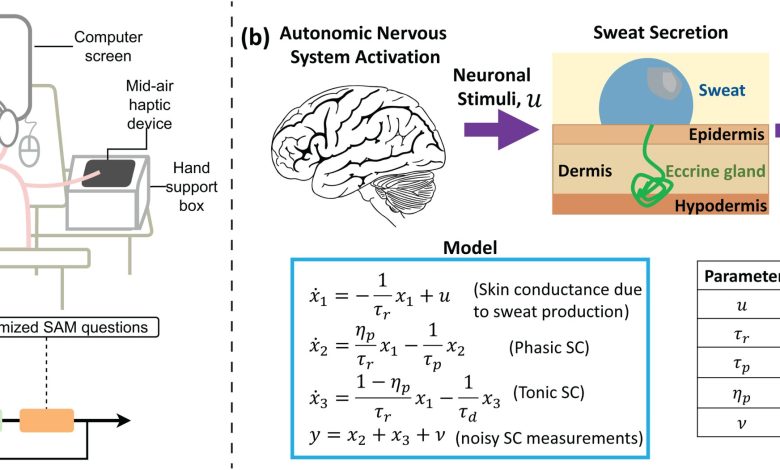 Visão geral da configuração experimental e abordagem de modelagem fisiológica. (a) Configuração do experimento mostrando (acima) um participante pronto para receber um estímulo auditivo, visual ou háptico enquanto sua condutância da pele (SC) é registrada e (abaixo) a linha do tempo do experimento. (b) Modelo fisiológico de variações de SC causadas pela ativação do SNA. Aqui, a atividade do SNA (ou seja, sinalização pulsátil neuronal cumulativa para as glândulas sudoríparas) é modelada como a entrada para um modelo de espaço de estados com os valores de SC como saída mensurável, e os parâmetros de secreção do suor e a atividade do SNA são estimados usando uma abordagem iterativa de maximização de expectativa. A atividade recuperada do SNA é então usada para estimar a excitação cognitiva usando um modelo estatístico. Crédito: PLOS Saúde Mental (2025). DOI: 10.1371/journal.pmen.0000463
