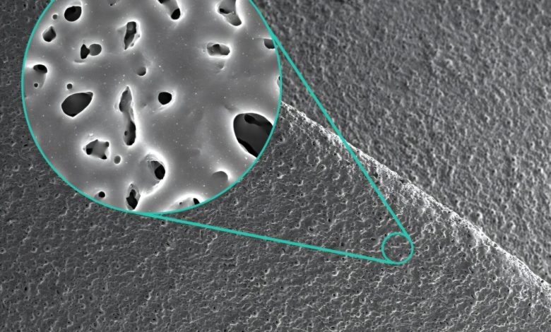 Micrografia eletrônica de varredura de uma camada de óxido de microarco poroso dopado com prata em titânio. Crédito: Fraunhofer IFAM