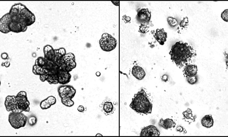 Essas imagens mostram organoides mamários de camundongos antes e depois do tratamento com uma nova terapia criada por pesquisadores da UC San Diego. À esquerda, os organoides estão inteiros. Após o tratamento, eles estouraram, indicando morte celular. Crédito: Karl Willert/UC San Diego Health Sciences