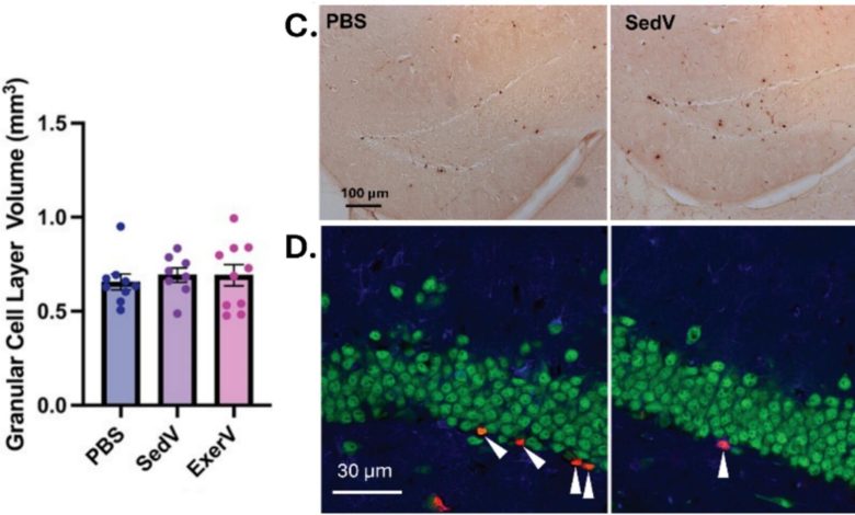 Camundongos receptores sedentários que receberam ExerVs exibiram um aumento robusto na neurogênese do hipocampo adulto. Os ExerVs aumentaram a densidade de células positivas para BrdU na camada de células granulares em aproximadamente 50% em relação aos grupos PBS e SedV.