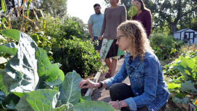 Jill Litt, professora da CU Boulder, verifica uma planta em uma horta comunitária em Denver, Colorado. Crédito: Glenn Asakawa/CU Boulder…
