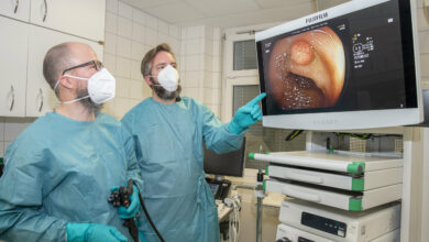 (da esquerda) Prof. Jacob Nattermann e Dr. Robert Hüneburg na endoscopia. Crédito: Rolf Müller, University Hospital Bonn (UKB) Pessoas com…