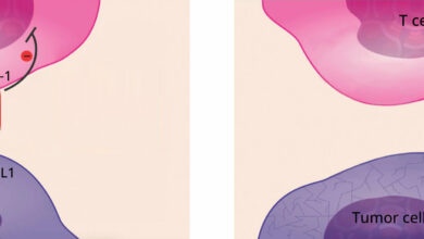 Quadro esquerdo: Normalmente, as células tumorais (roxo) escapam das células T do sistema imunológico (rosa) expressando uma proteína de ponto…