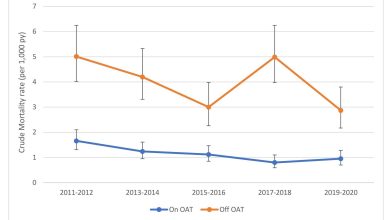 Taxas brutas de mortalidade por suicídio ao longo do tempo, por exposição à terapia com agonistas opioides (OAT). Crédito: Vício…