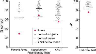 Resultados dos testes de reconhecimento facial. O painel esquerdo mostra % correto para rostos famosos, Doppelganger e Cambridge Face Memory…