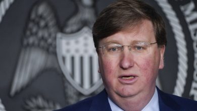 O governador republicano do Mississippi, Tate Reeves, fala durante uma coletiva de imprensa, terça-feira, 28 de fevereiro de 2023, em…
