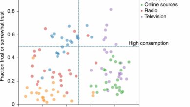 Confiança versus consumo de fontes de notícias e mídia. Cada ponto é um par de país e fonte para todos…