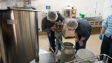 Amy Fletcher, gerente de fábrica piloto, e Reid Waterman, especialista em ciências de alimentos do terceiro ano, iniciam a máquina…