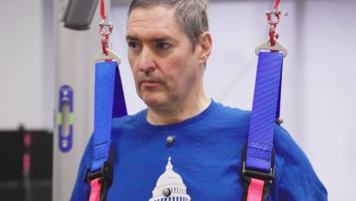Esta imagem do vídeo fornecida pela UPMC e pela Universidade de Pittsburgh Health Sciences mostra Doug McCullough, que tem atrofia…
