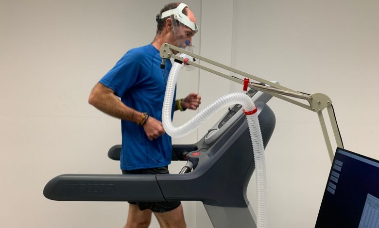 O professor de biologia Ignacio Moore participa do estudo fazendo um teste de VO2 máximo na esteira. Crédito: Kristen Howard