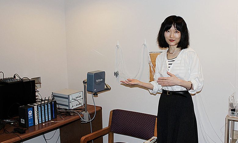 Panying Rong mostra alguns dos equipamentos que os pesquisadores em seu laboratório usam para medir os órgãos da fala. Crédito: Rick Hellman/KU